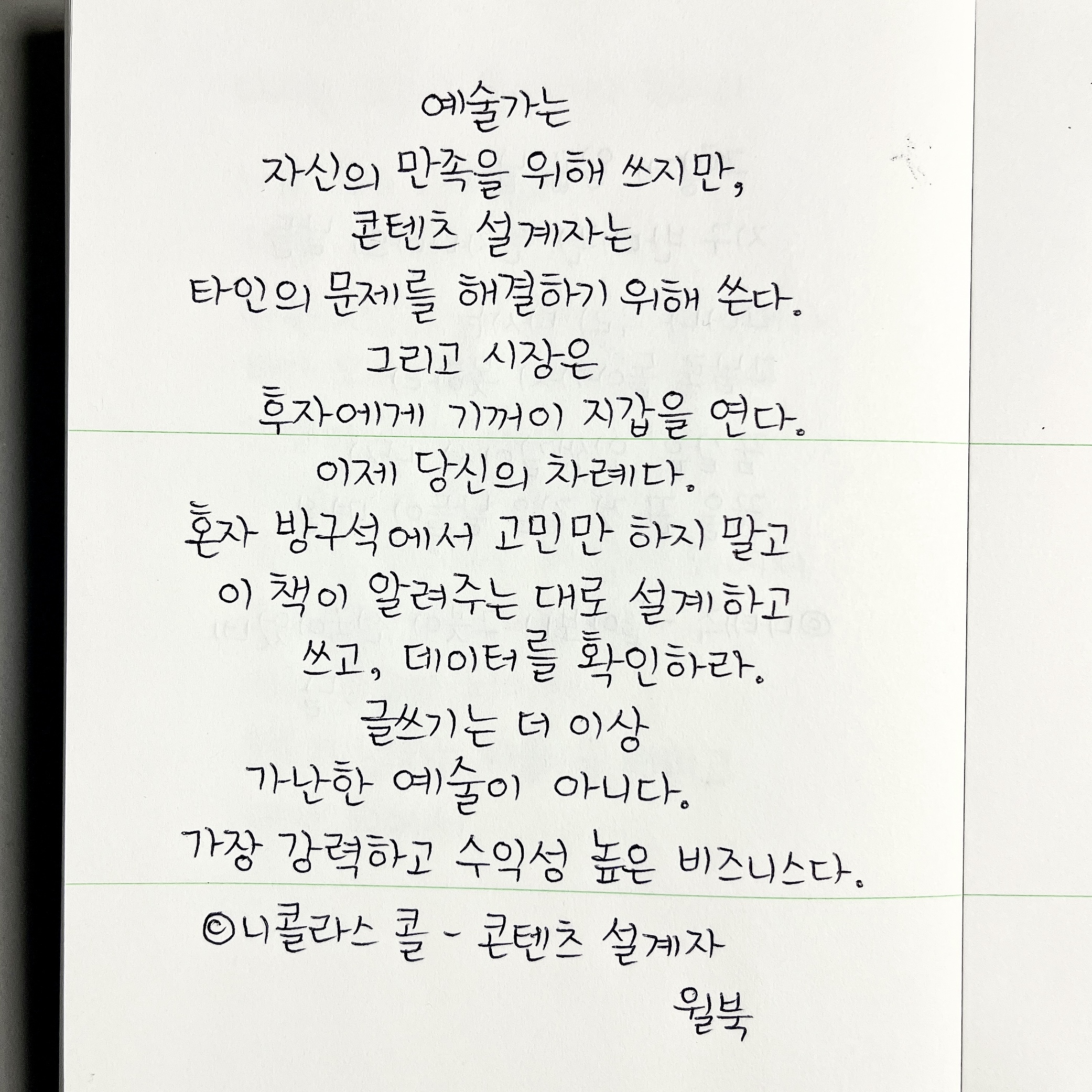 | 돈 되는 글쓰기. 니콜라스 콜 - 콘텐츠 설계자 (0) | 2026.02.15 |