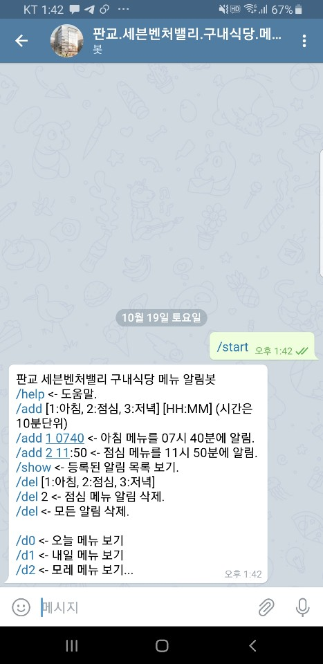 봇과 채팅을 시작하면 도움말이 표시됩니다.
