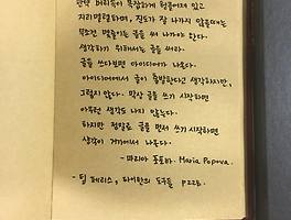 write (1) 썸네일형 리스트형 머리가 복잡할땐 글을 써보세요 - 마리아 포포바 Maria Popova 머리가 혼란스럽고 정리가 안될 때에는손으로 글을 한번 써보세요.혼란스럽게 하는 주제와 관계가 없어도 되고,어떨 때에는 관계가 없는 글을 쓰는게 더 좋습니다. ... 만약 머리속이 복잡하게 헝클어져 있고 지리멸렬하며,진도가 잘 나가지 않을 때에는무조건 몇 줄이든 글을 써 나가야 한다. 생각하기 위해서는 글을 써라.글을 쓰다보면 아이디어가 나온다.아이디어에서 글이 출발한다고 생각하지만, 그렇지 않다. 막상 글을 쓰기 시작하면 아무런 생각도 나지 않는다.하지만 정말로 글을 먼저 쓰기 시작하면 생각이 거기에서 나온다. - 마리아 포포바 Maria Popova- 팀 패리스, 타이탄의 도구들 P228 ... 글을 쓴다는 건 나와 내 주위를 돌아보는 겁니다.곁가지를 버리고, 정말 중요한걸 생각한다는 거에요. 한번 써.. 이전 1 다음 * 쿠팡 파트너스 활동을 통해 일정액의 수수료를 제공받을 수 있습니다.